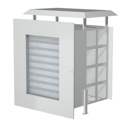 Prallblechvorbau zur Montage an der Fassade für eine gesicherte Funktion unabhängig von Windeinflüssen, aus Edelstahl, wahlweise aus verzinktem Stahlblech mit Pulverbeschichtung in RAL nach Wahl.